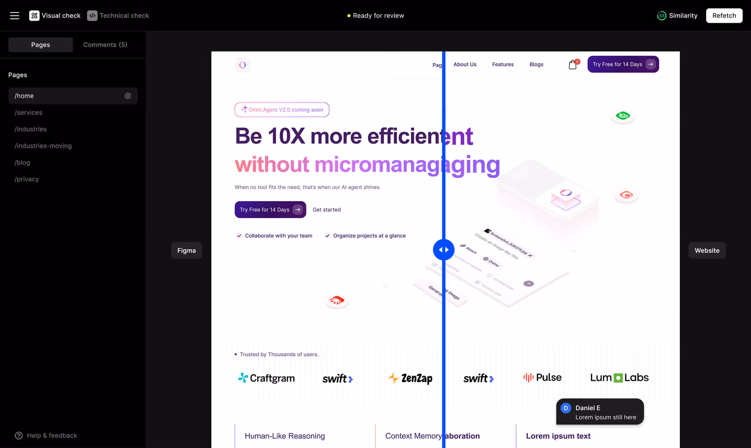 Slide between Figma and the live site to instantly spot layout, spacing, and visual differences.