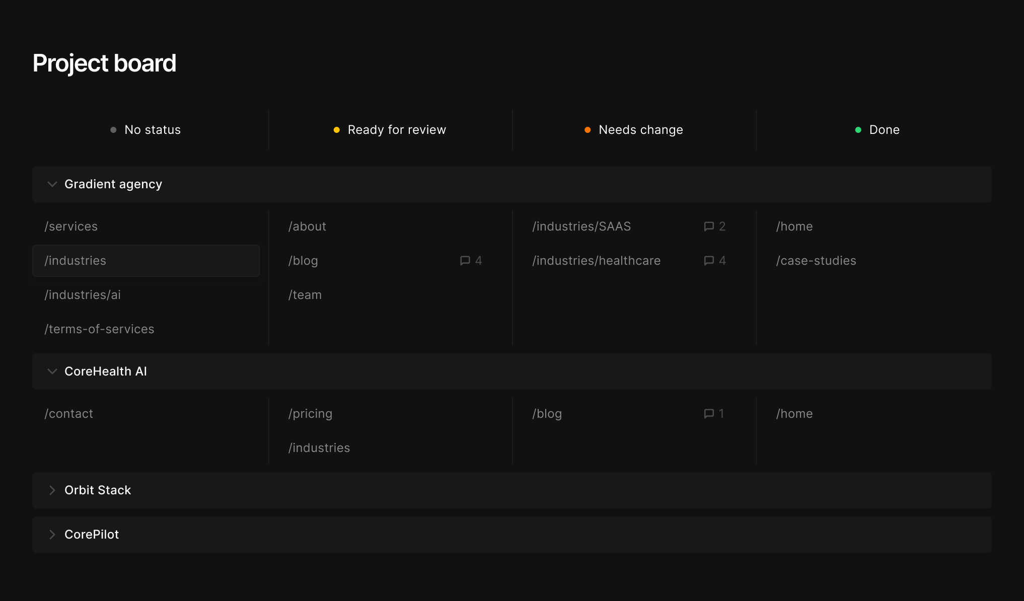 View all projects in one place and track progress across pages, with review status visible at a glance.
